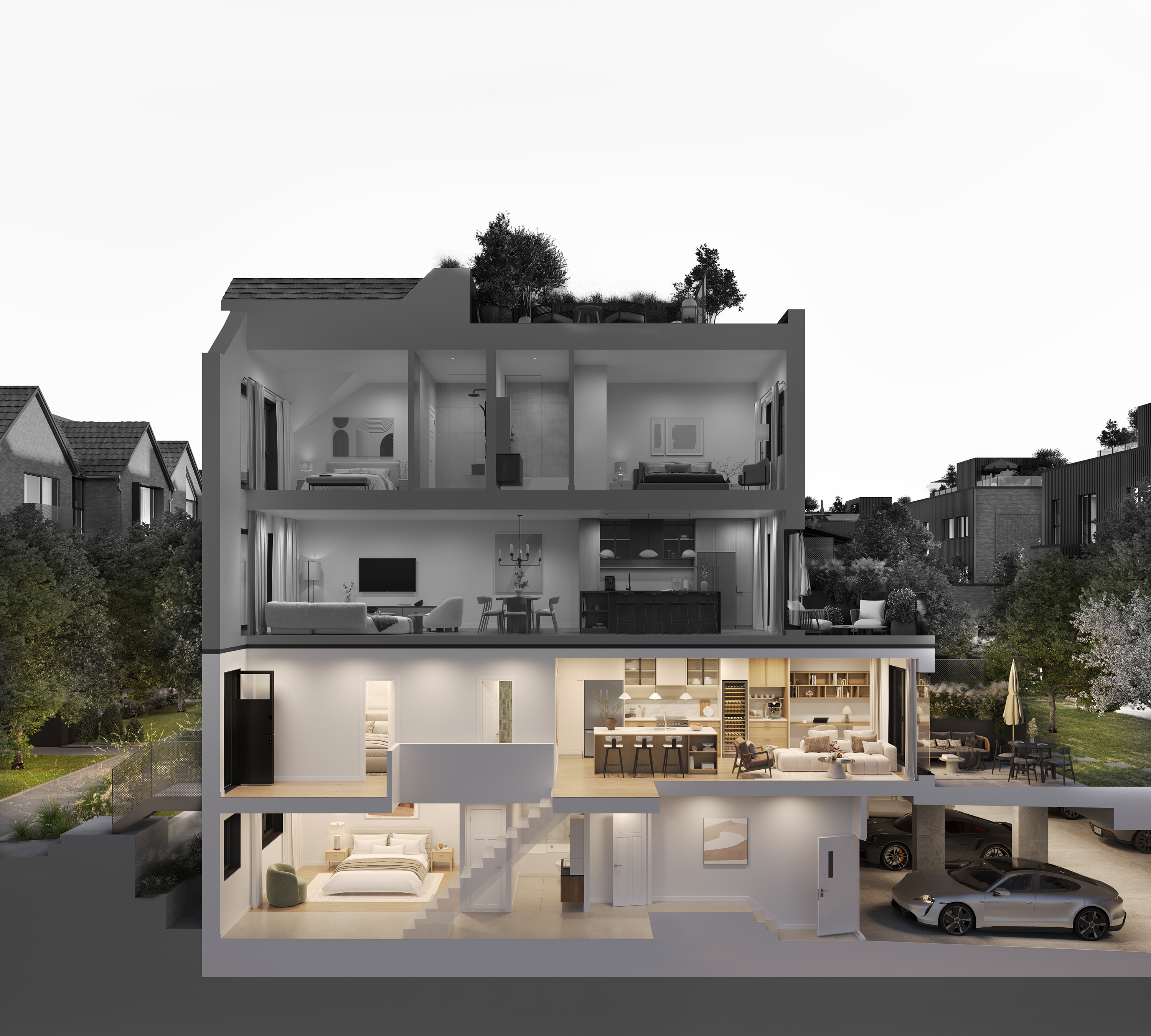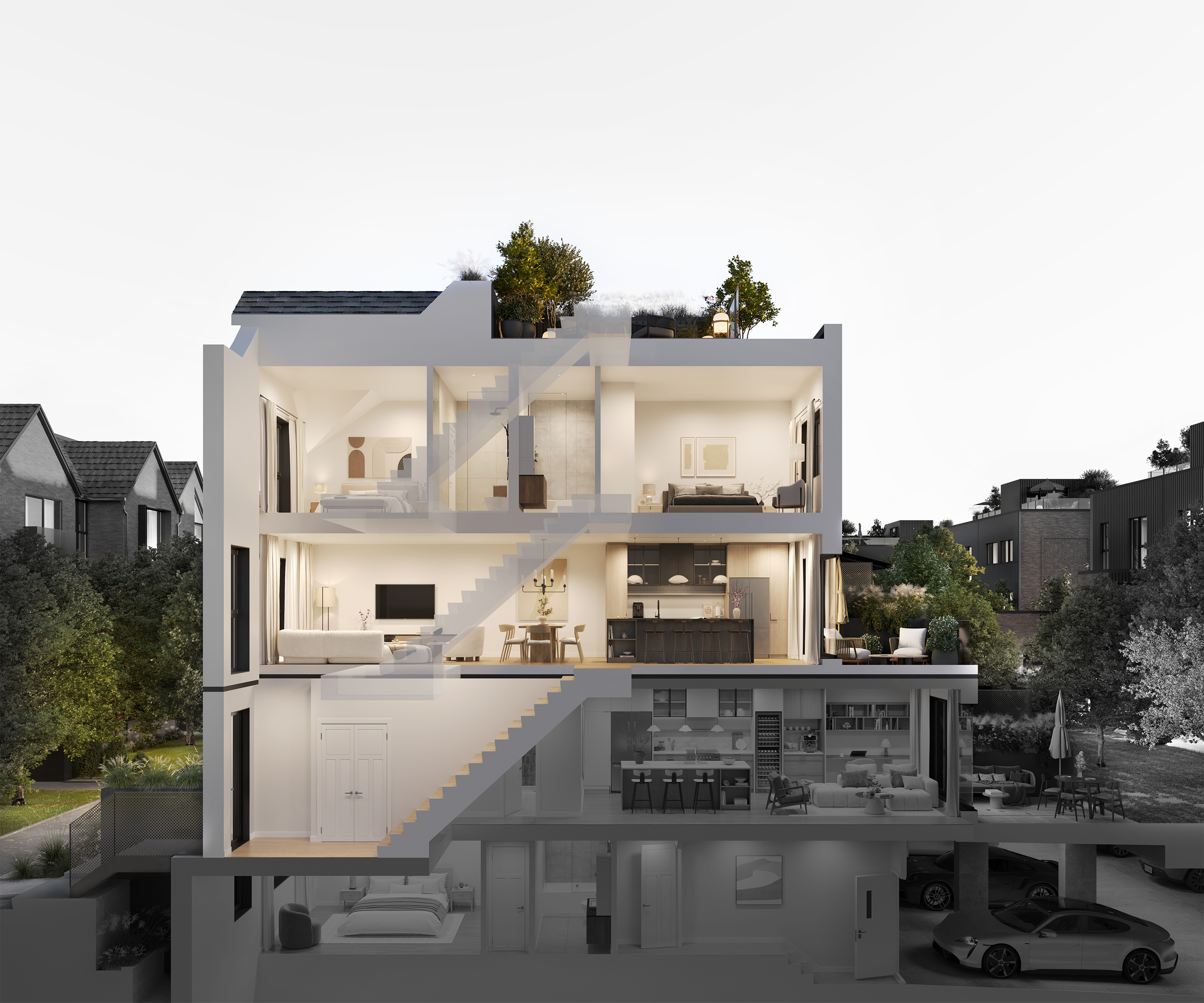 The lower units offer direct access to indoor parking from the lower floor and come with a built-in storage room. The ground-level terrace also offers the option of adding a jacuzzi.